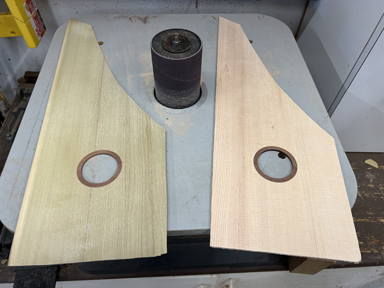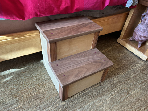 The left one is black walnut and maple with a black walnut frame. The right one is all black walnut with a maple frame. The little white pieces are the remains of birch biscuits, used for joining wood together.
